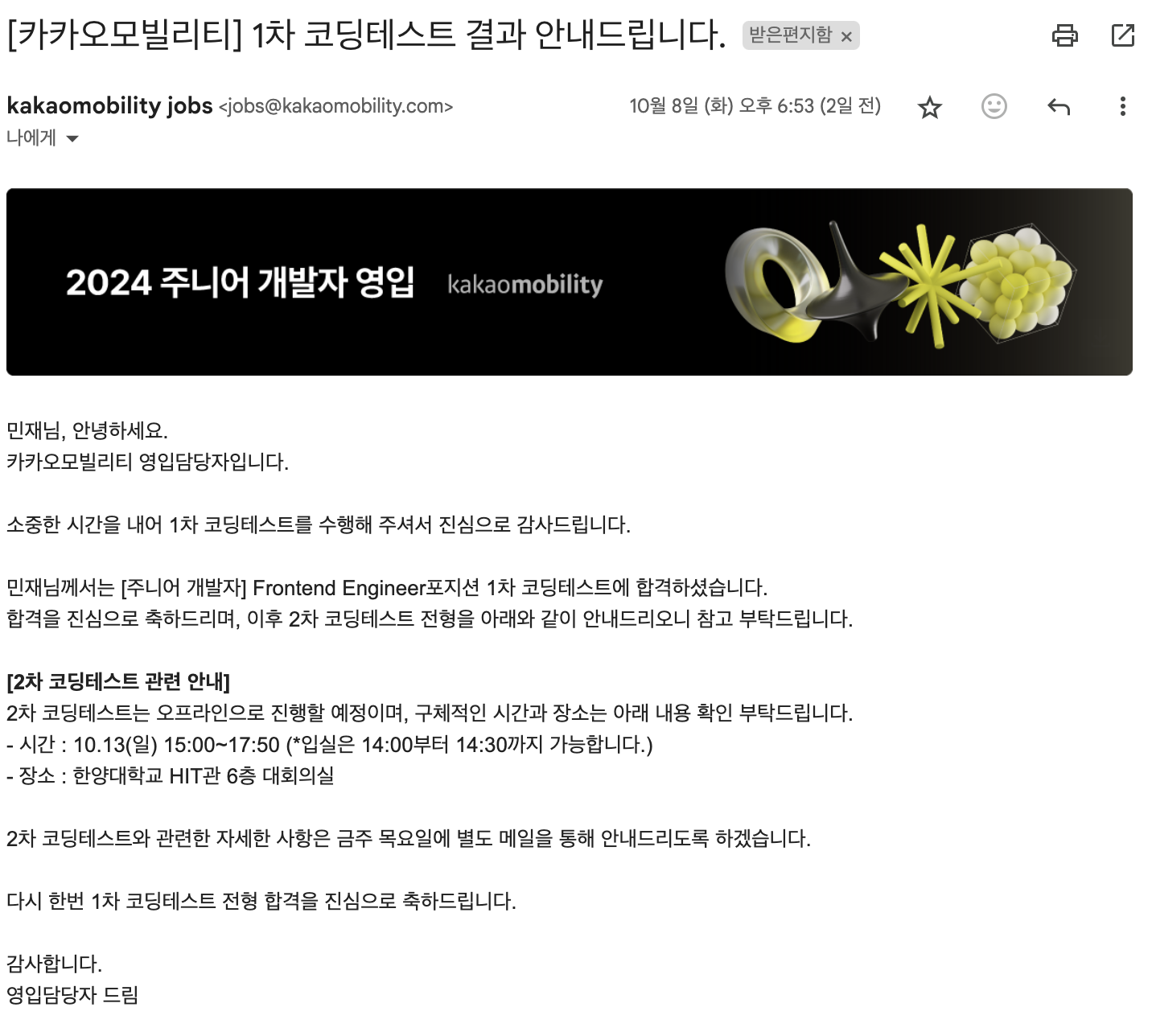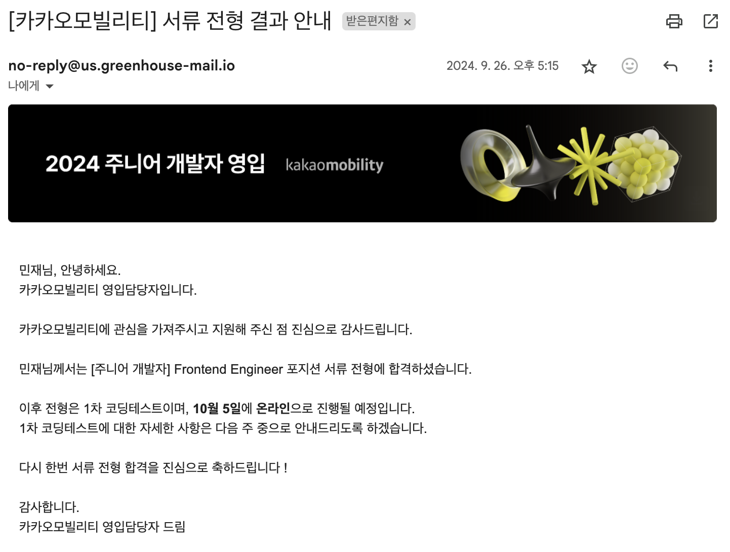 많이 준비가 되지 않았다고 생각했는데, 감사하게도 서류 합격 메일이 도착했습니다.