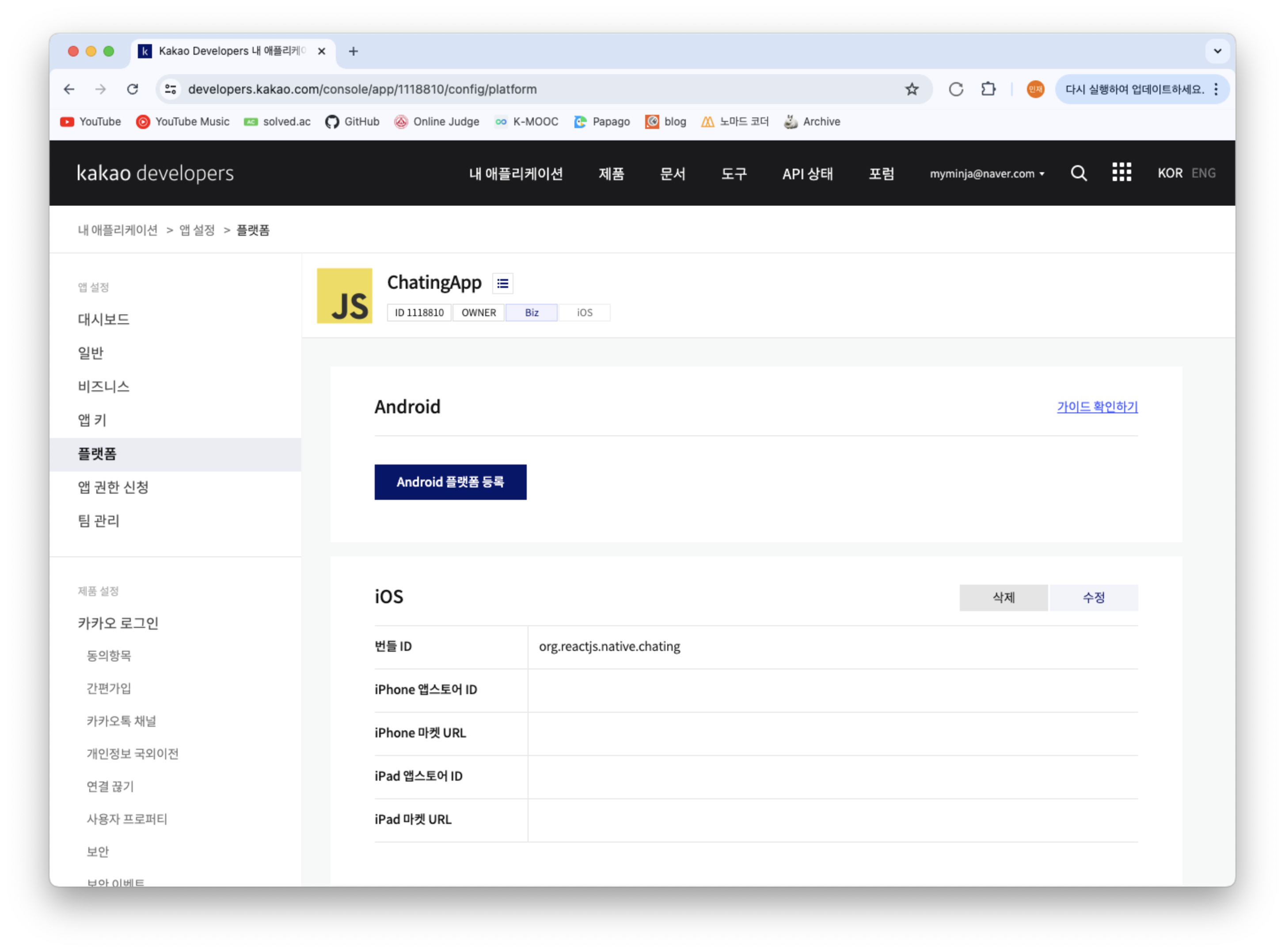 등록한 애플리케이션에 들어가 내 애플리케이션 > 앱 설정 > 플랫폼 탭에 들어갑니다.