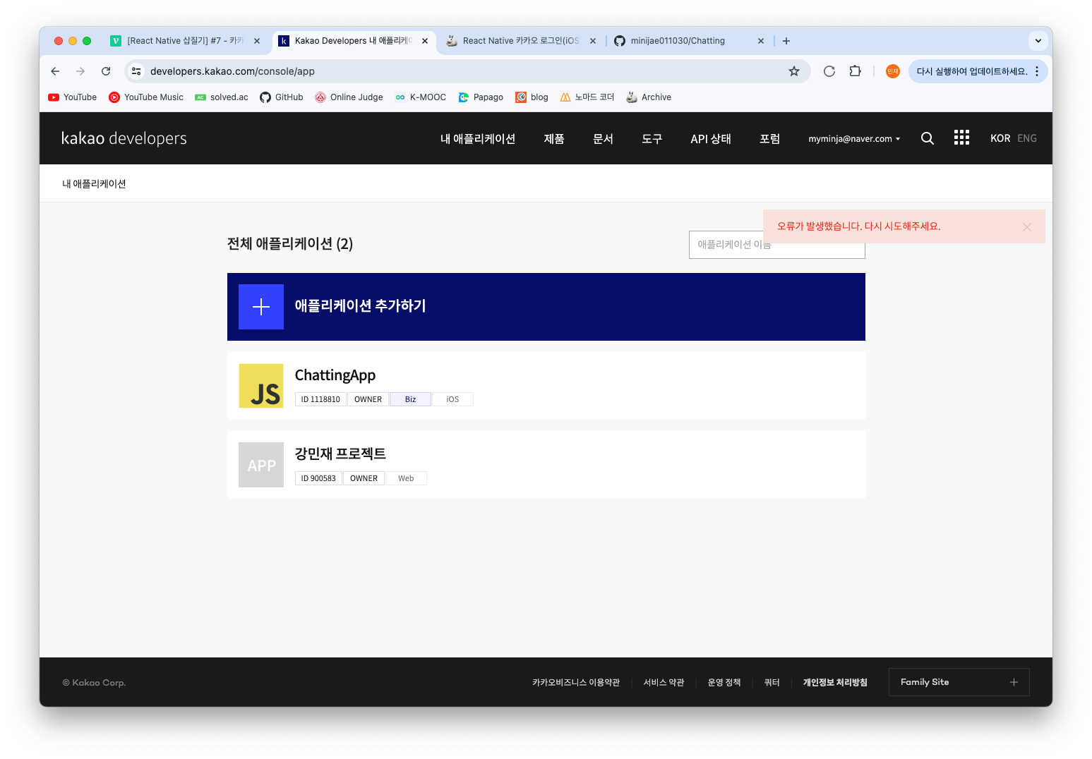 회원가입을 완료 한 후 내 애플리케이션 > 애플리케이션 추가하기 버튼을 눌러줍니다.