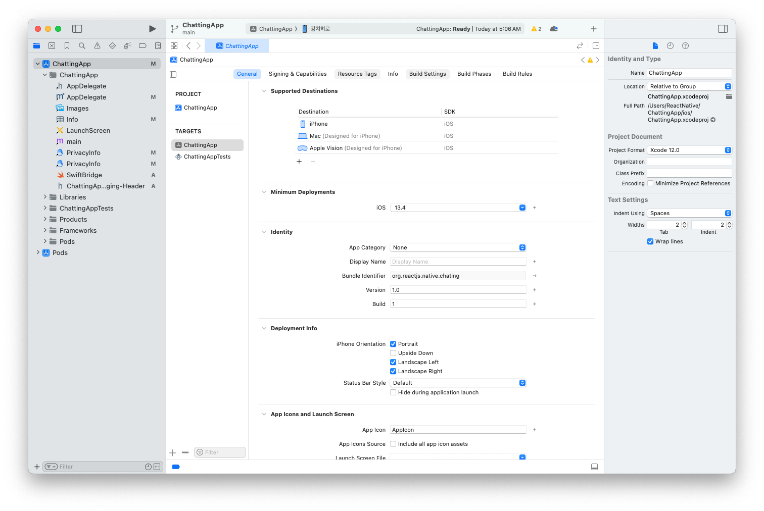 XCode에서 ios/프로젝트.xcworkspace 파일을 열어주세요.