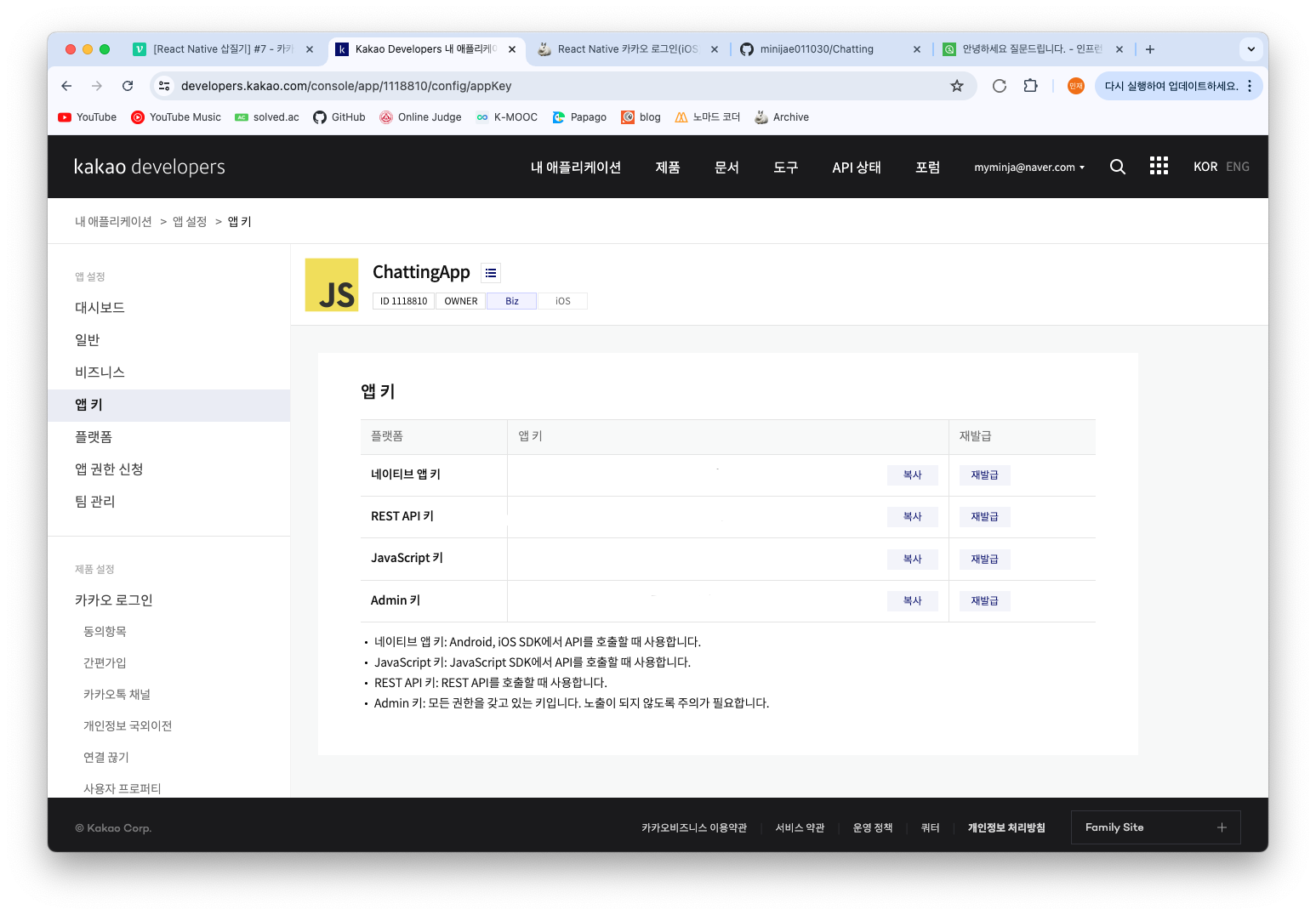 내 애플리케이션 > 앱 설정 > 앱 키 탭에 들어갑니다.